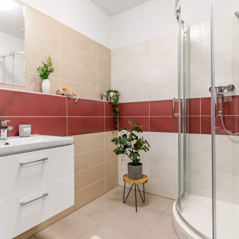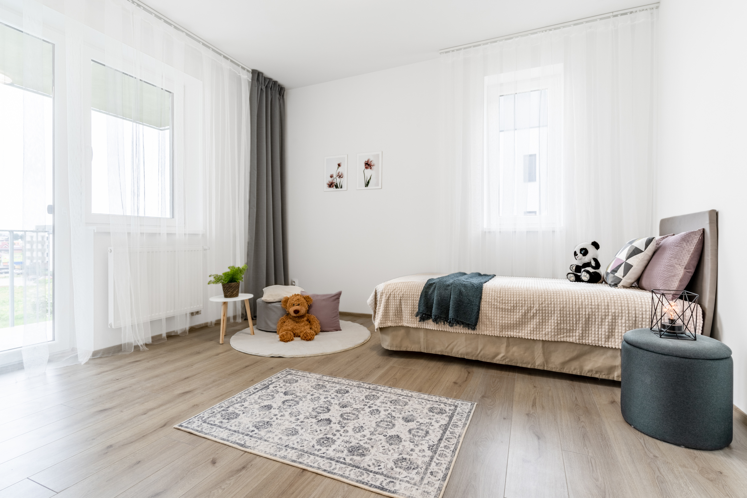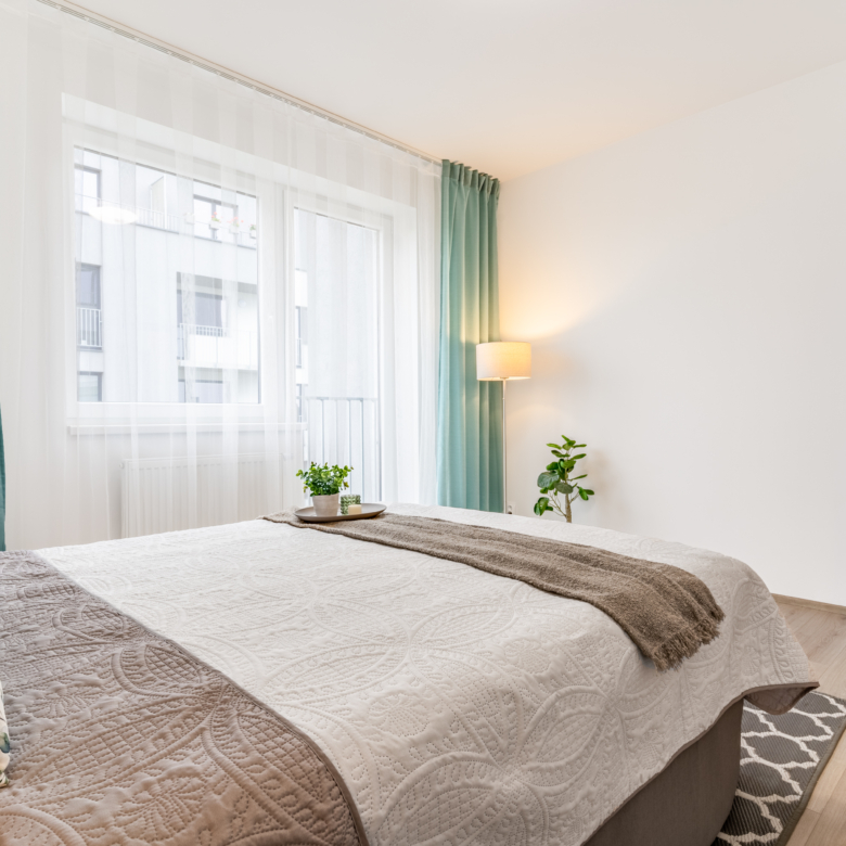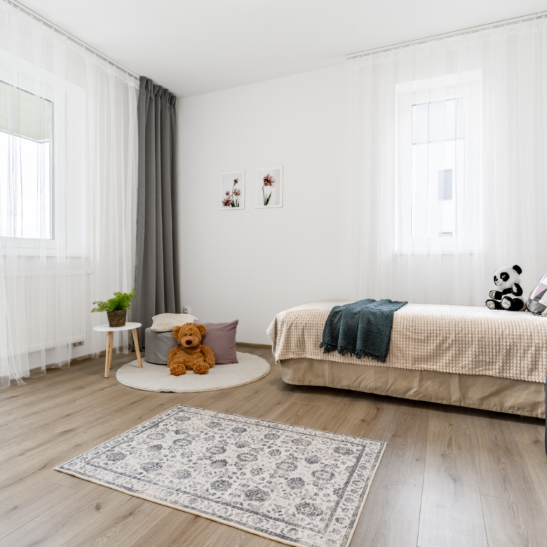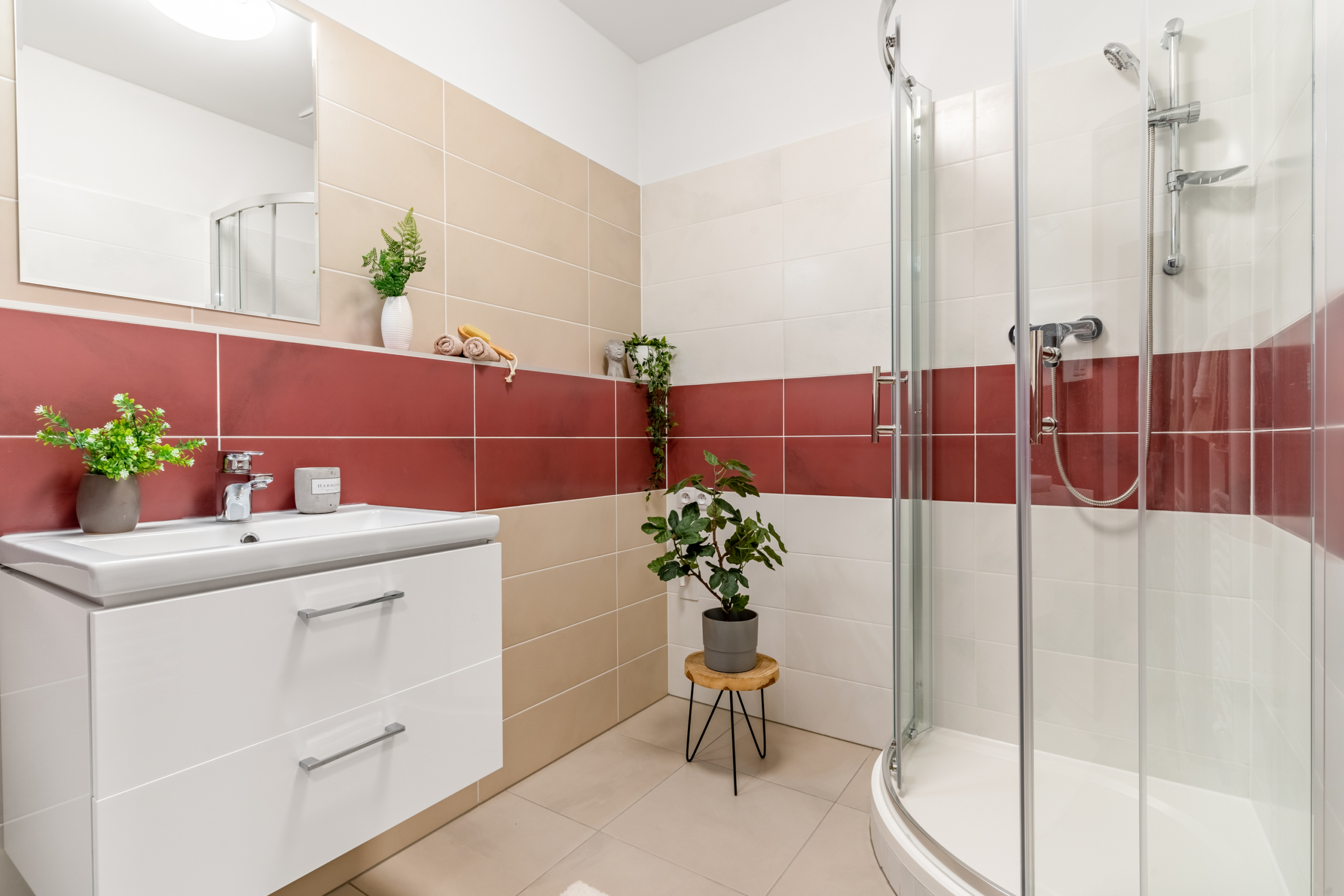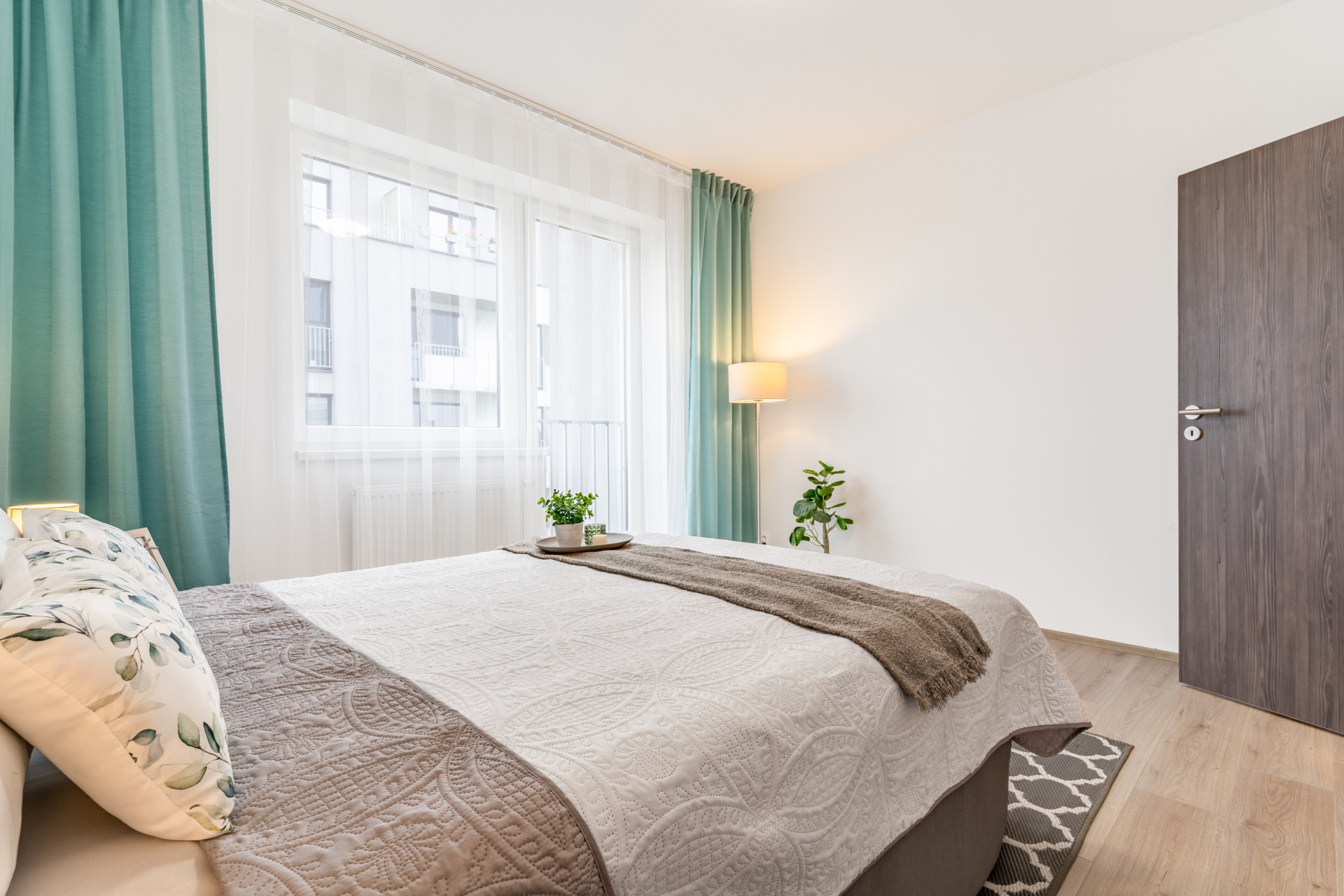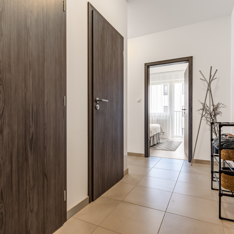 Dále zde najdete dvě samostatné ložnice – ideální jako hlavní ložnice a dětský pokoj či pracovna. Koupelna je vybavena sprchovým koutem, umyvadlem s úložnou skříňkou, zrcadlem, LED osvětlením a žebříkovým topením. Samostatné WC disponuje vlastním umyvadlem a moderním vybavením. V celém bytě jsou použity kvalitní materiály – plovoucí podlahy (lamino), keramické obklady, designové interiérové dveře, stropní LED osvětlení a stropní kolejnice na závěsy či garnýže.