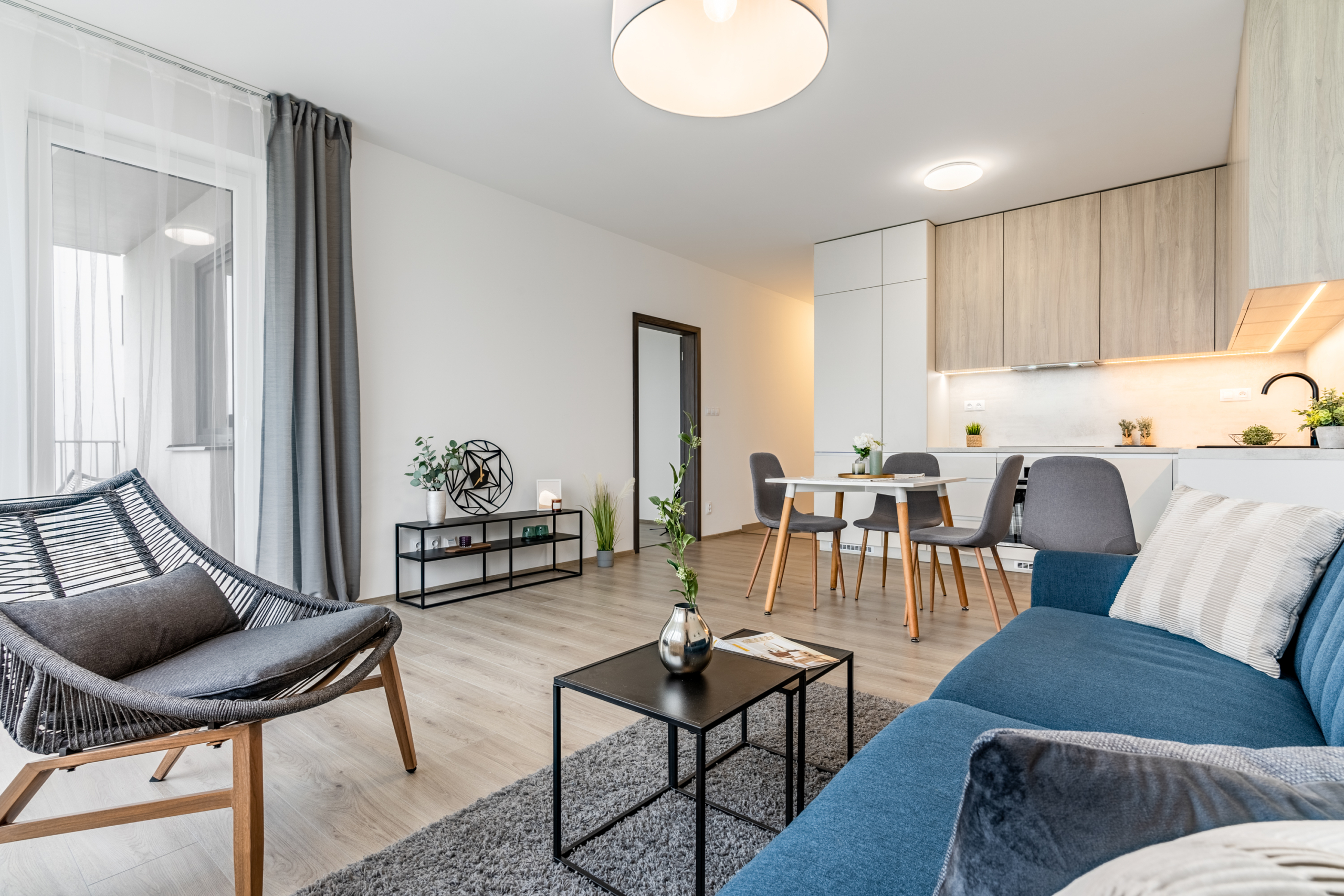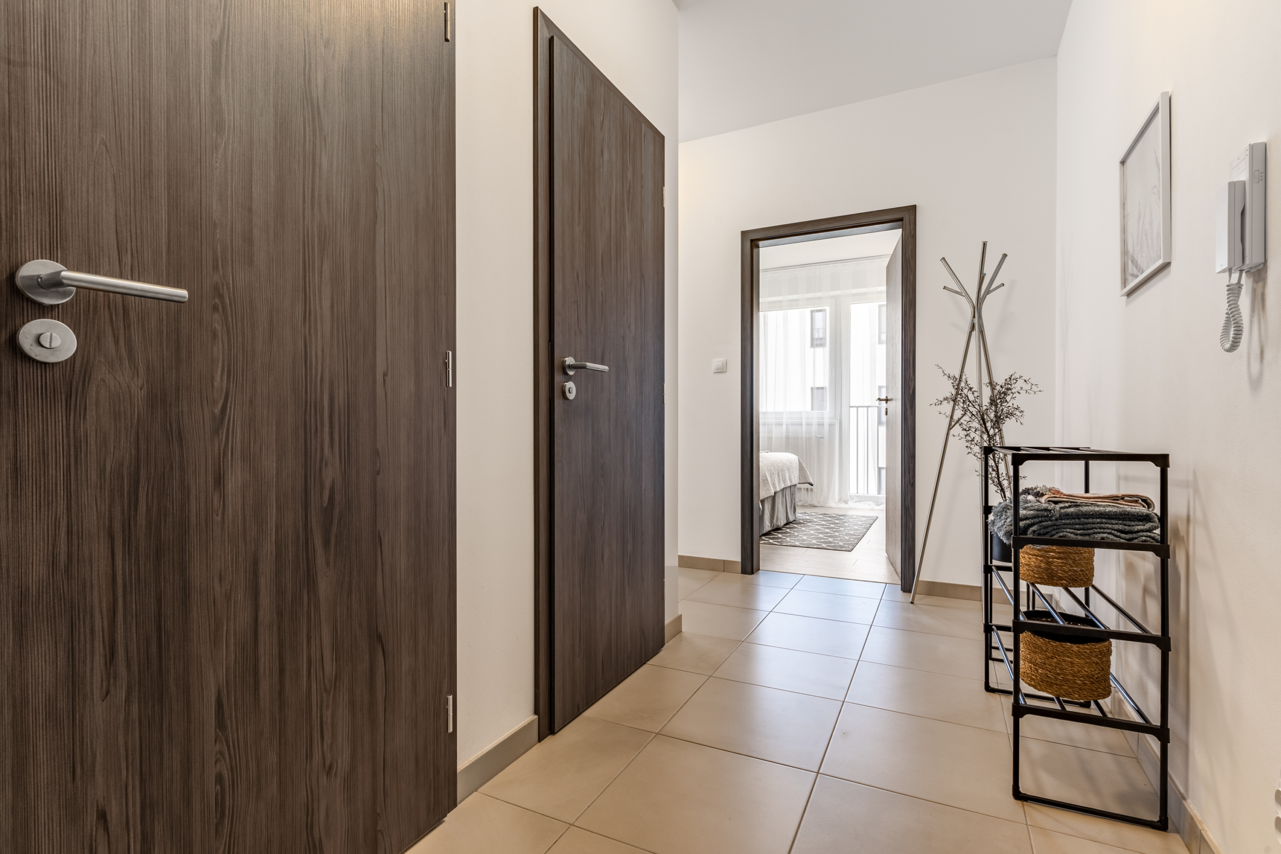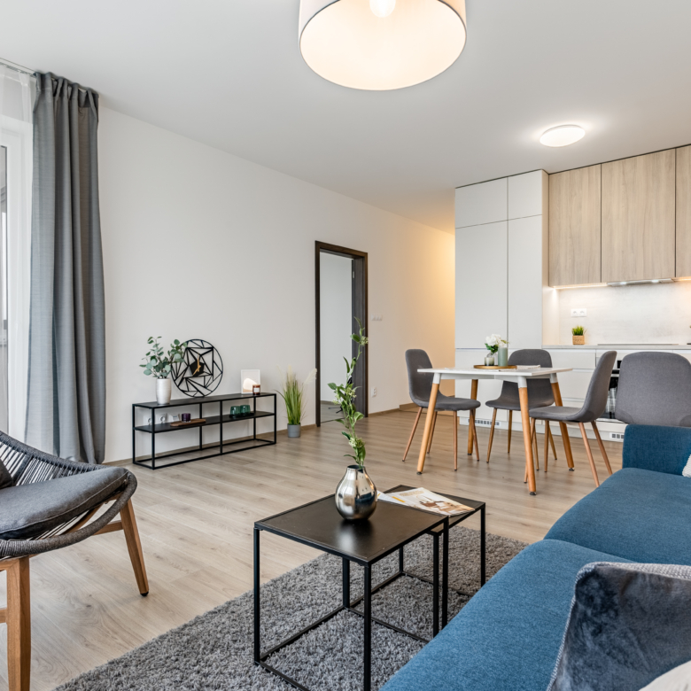 Dispozice a vybavení: Za vstupními bezpečnostními dveřmi se nachází předsíň s domácím telefonem a LED stropním osvětlením. Hlavní obytný prostor tvoří prostorný obývací pokoj s moderním kuchyňským koutem. Kuchyňská linka na míru je vybavena vestavnými spotřebiči – indukční varnou deskou, elektrickou troubou, digestoří, myčkou, lednicí a granitovým dřezem s černou baterií. Oceníte i velká okna, které prostor příjemně prosvětlují.