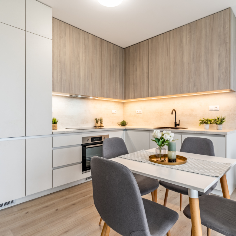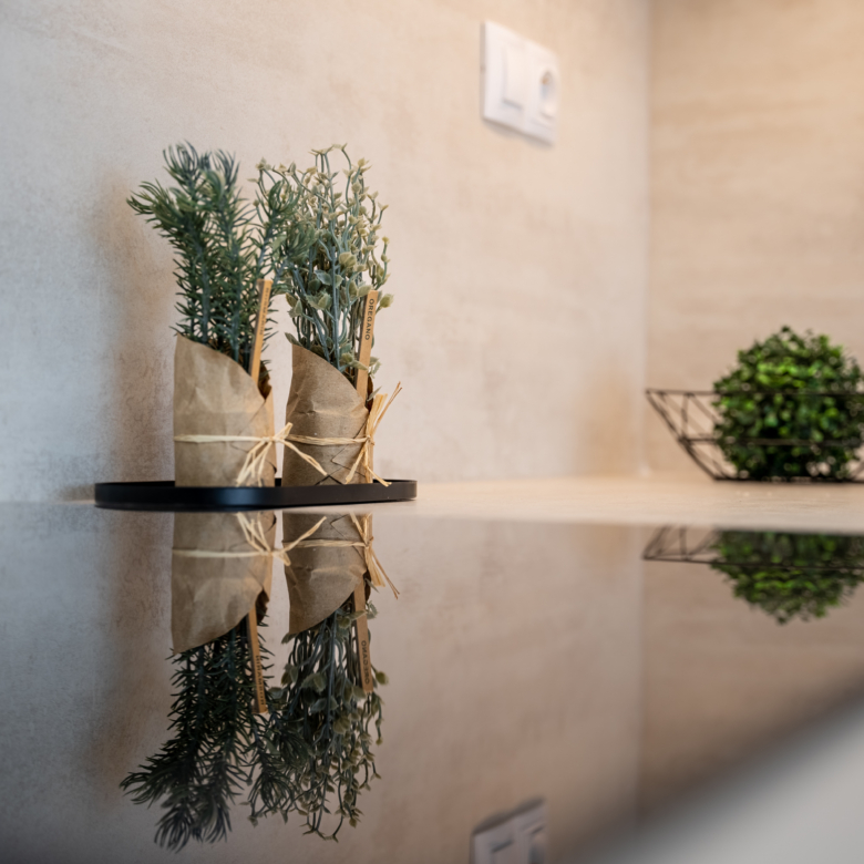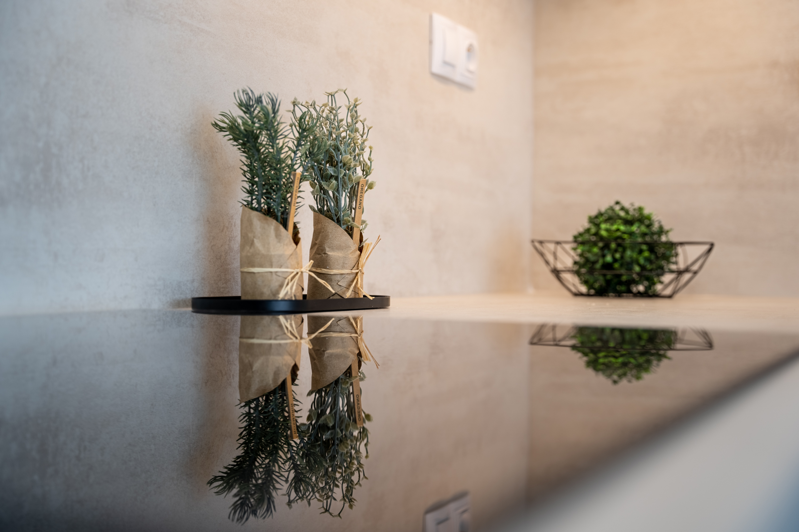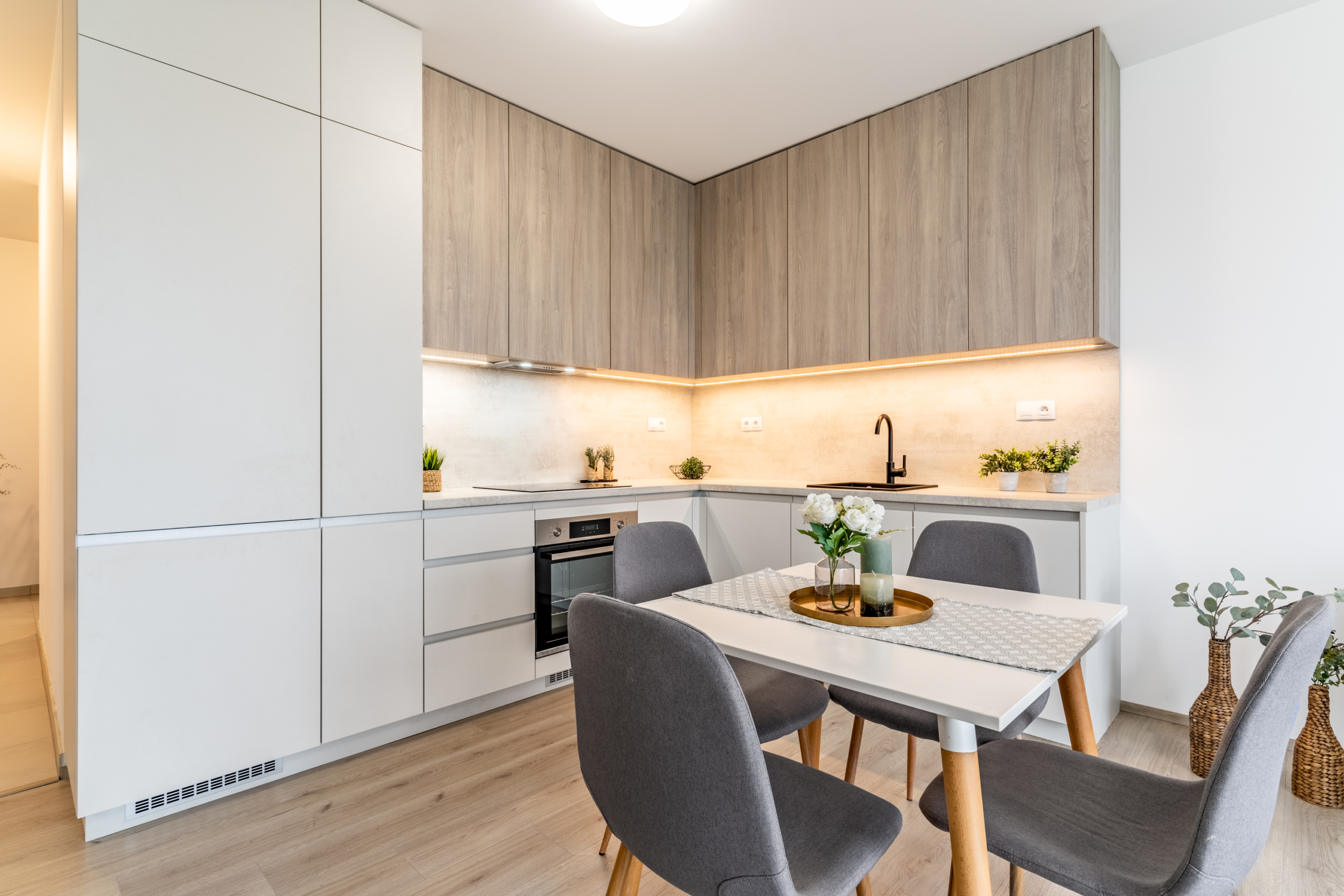 Dispozice a vybavení: Za vstupními bezpečnostními dveřmi se nachází předsíň s domácím telefonem a LED stropním osvětlením. Hlavní obytný prostor tvoří prostorný obývací pokoj s moderním kuchyňským koutem. Kuchyňská linka na míru je vybavena vestavnými spotřebiči – indukční varnou deskou, elektrickou troubou, digestoří, myčkou, lednicí a granitovým dřezem s černou baterií. Oceníte i velká okna, které prostor příjemně prosvětlují.
