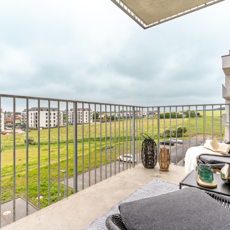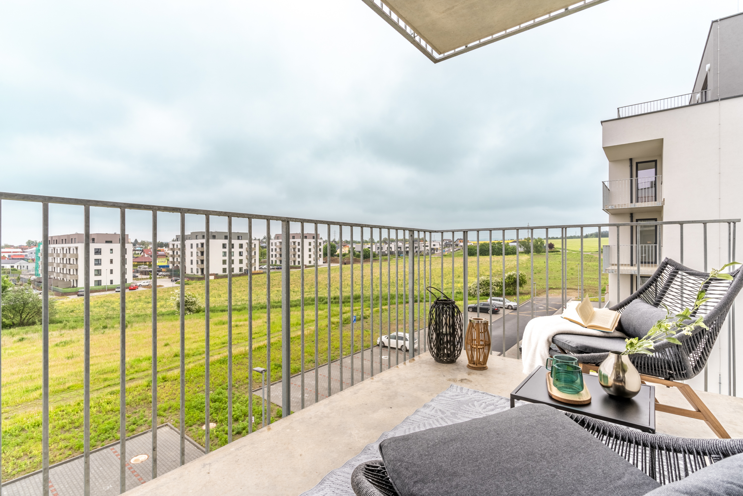 Byt vyniká promyšlenou dispozicí, světlými prostory a vlastním balkonem, který je přístupný hned ze dvou místností. K bytu náleží sklepní kóje a garážové stání v 1. podzemním podlaží domu, což významně zvyšuje komfort bydlení.